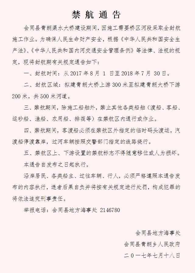 会同新闻网7月27日讯(记者 何乐川 通讯员 曾维义)今日,记者从会同县地方海事处获悉,因青朗渠水大桥施工需要,施工桥区河段即从拟建青朗大桥上游300米至拟建青朗大桥下游200米共500米河道,自2017年8月1日至2018年7月30日,将采取全封航施工作业。