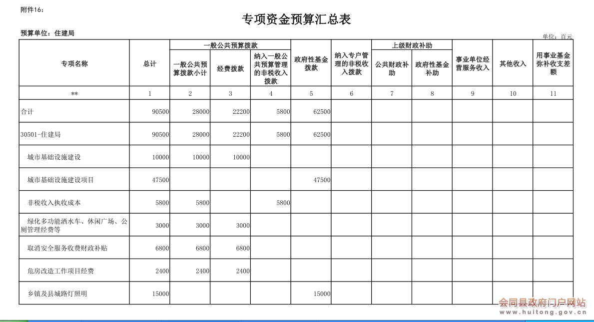 (三)项目支出情况:非税收入征收成本项目5800百元,危房改造工作经费项目2400百元。取消安全服务费财政补贴6800百元,绿化多功能洒水车、休闲广场、公厕管理等项目3000百元,城市基础设施建设项目10000百元。
