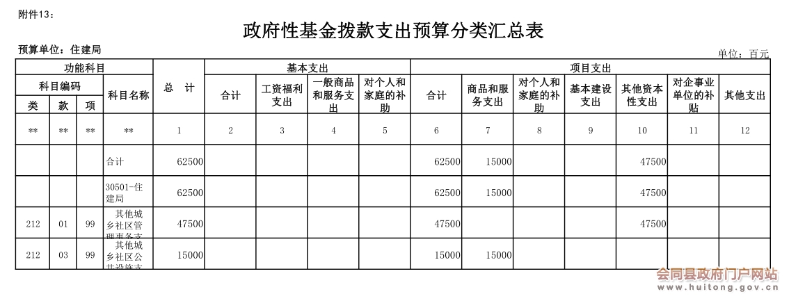 政府性基金安排项目支出62500百元,具体项目为:乡镇及县城路灯照明15000百元,城市基础设施建设项目47500百元。