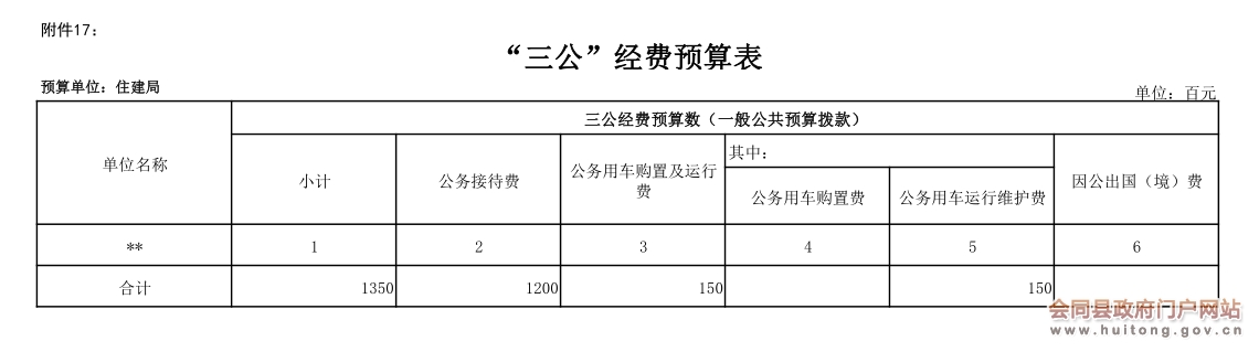 (四)“三公”经费支出情况:2017年安排“三公”经费支出1350百元。其中:公务接待费1200百元,公车经费150百元。
