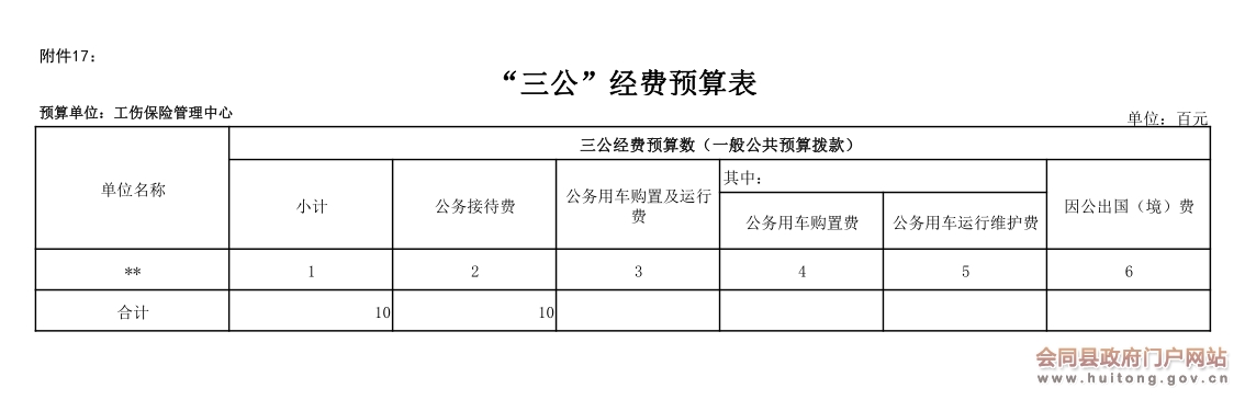 (四)“三公”经费支出情况:2017年安排“三公”经费支出10百元,与2016年预算持平。其中:公务接待费10百元。