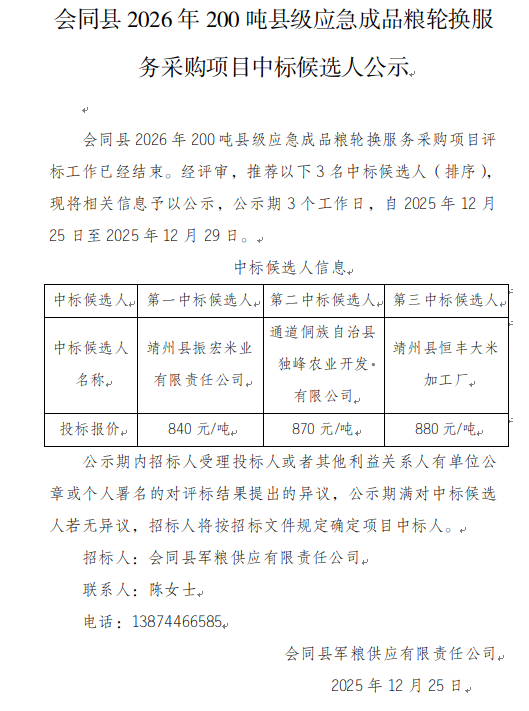 会同县2026年200吨县级应急成品粮轮换服务中标候选人公示