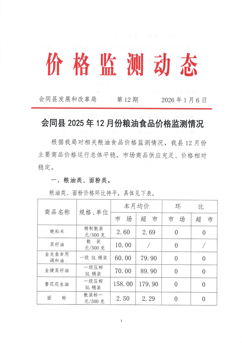 会同县2025年12月份粮油食品价格监测情况