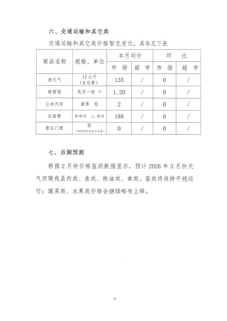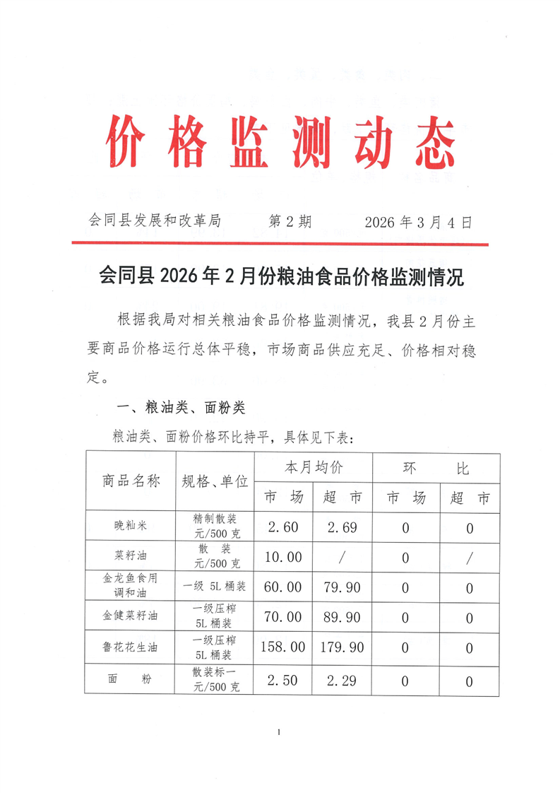 会同县2026年2月份粮油食品价格监测情况