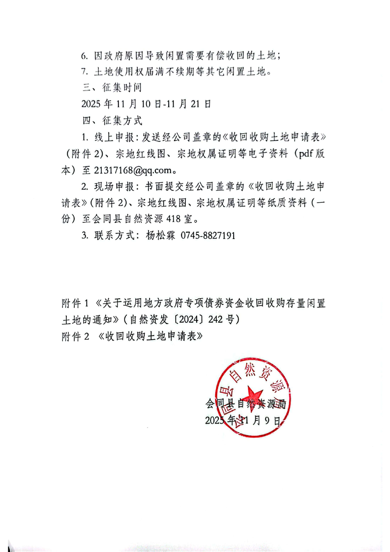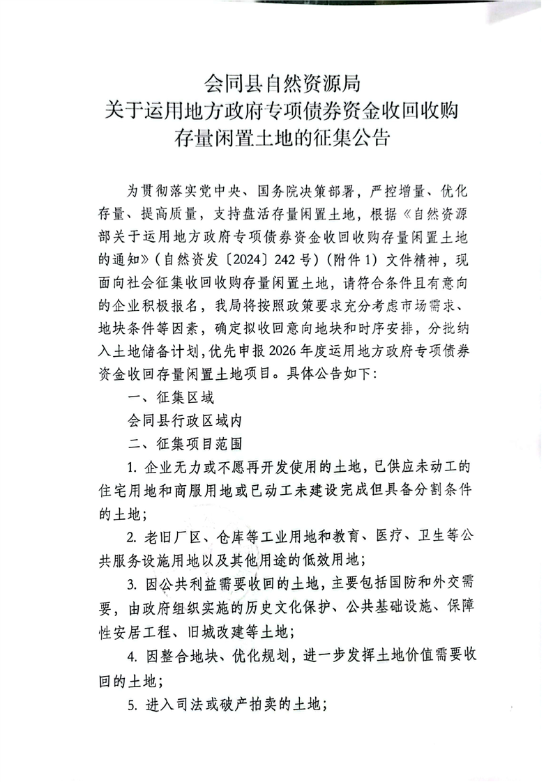 会同县自然资源局关于运用地方政府专项债券资金收回收购存量闲置土地的征集公告