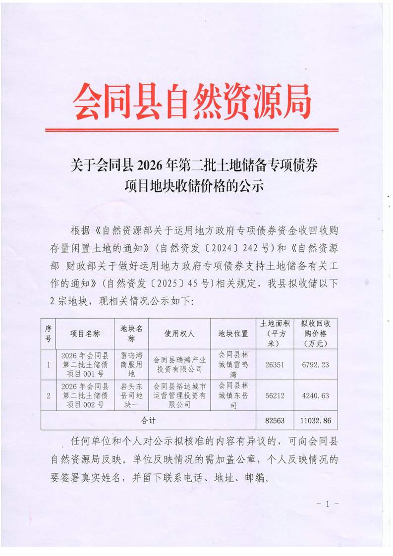 关于会同县2026年第二批土地储备专项债券项目地块收储价格的公示