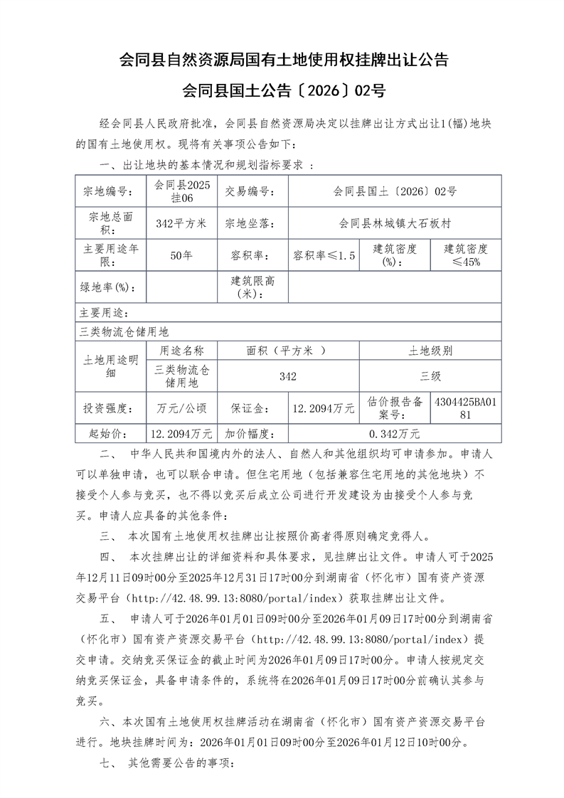 会同县自然资源局国有土地使用权挂牌出让公告(会同县国土公告〔2026〕02号交易公告)