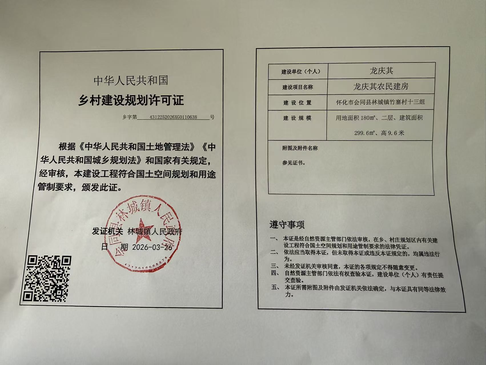 关于林城镇竹寨村龙庆其等人乡村建设规划许可证