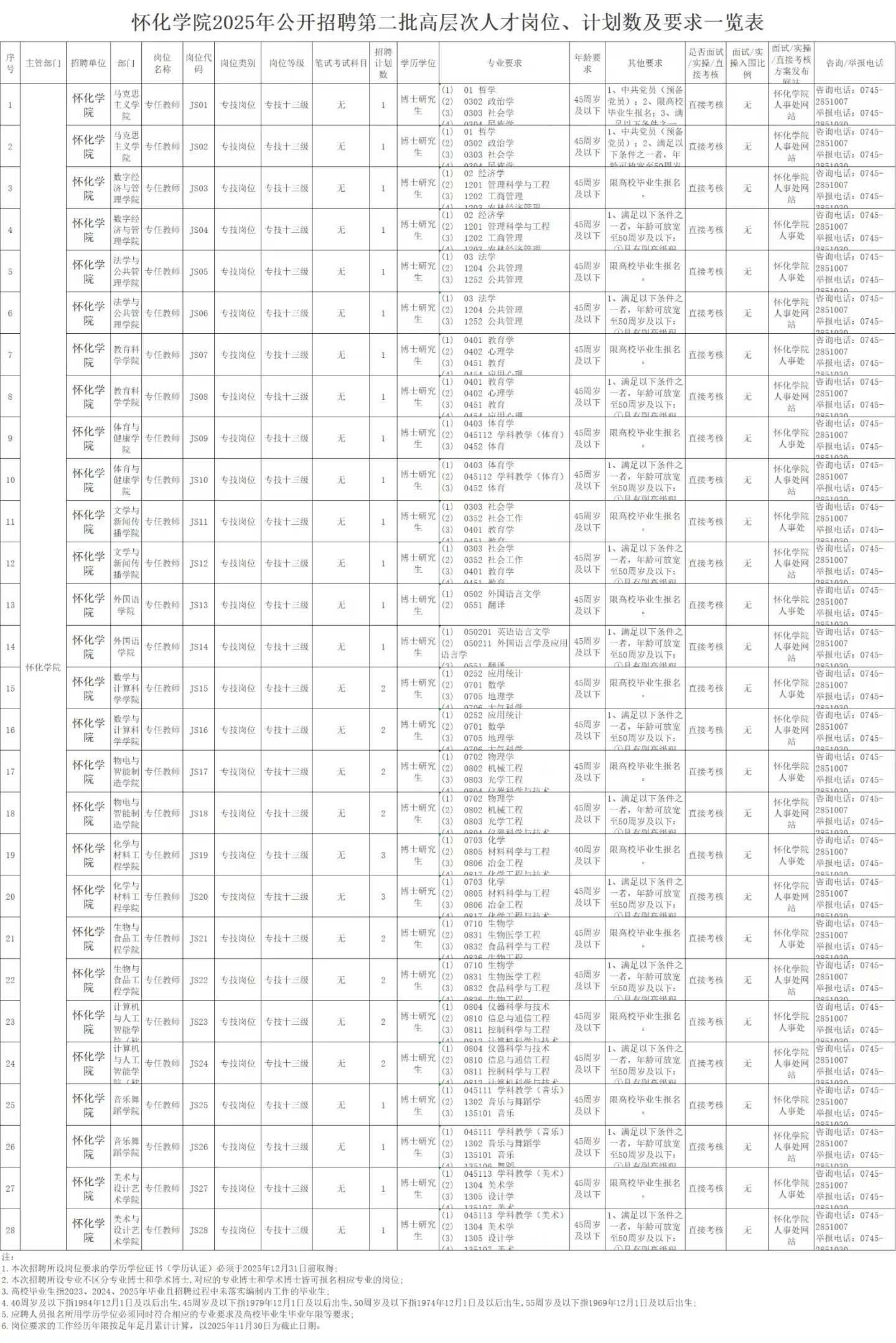 1.怀化学院2025年公开招聘第二批高层次人才岗位、计划数及要求一览表