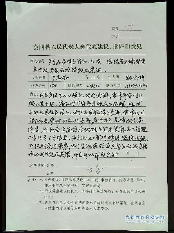 第-71-号建议《关于为高椅乡翁江、红坡、槐枧等边境村重点地段安装监控设施的建议》
