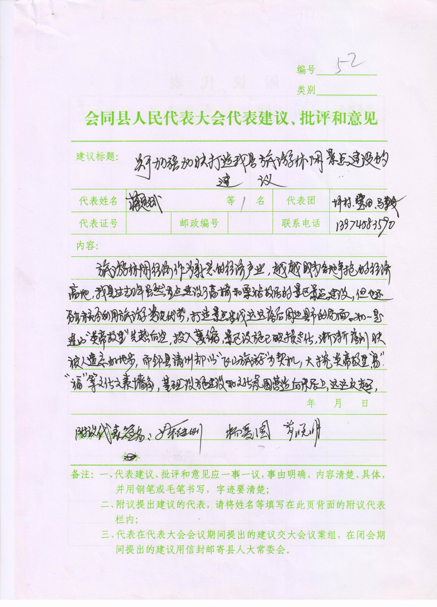 第-52-号建议《关于加快打造我县旅游休闲景点的建议》