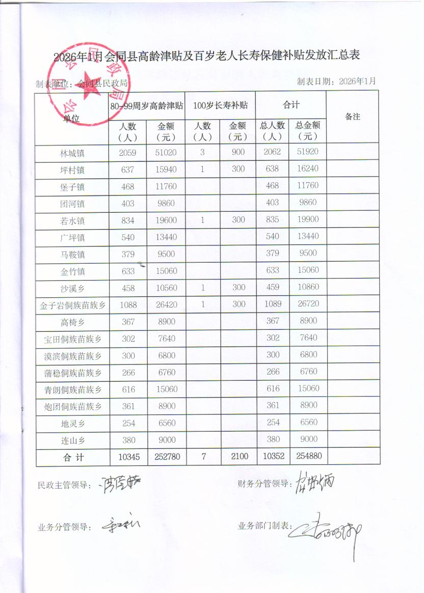2026年1月会同县高龄津贴及百岁老人长寿保健补贴发放汇总表