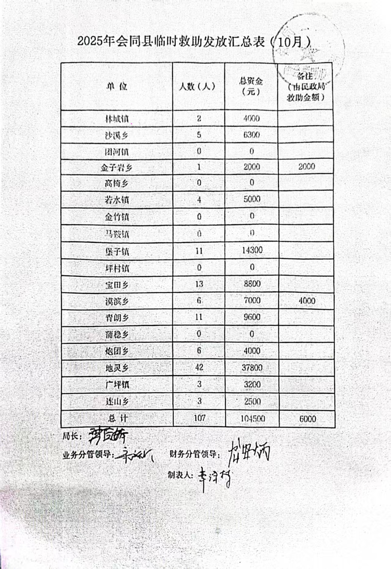 2025年会同县临时救助发放汇总表(10月)