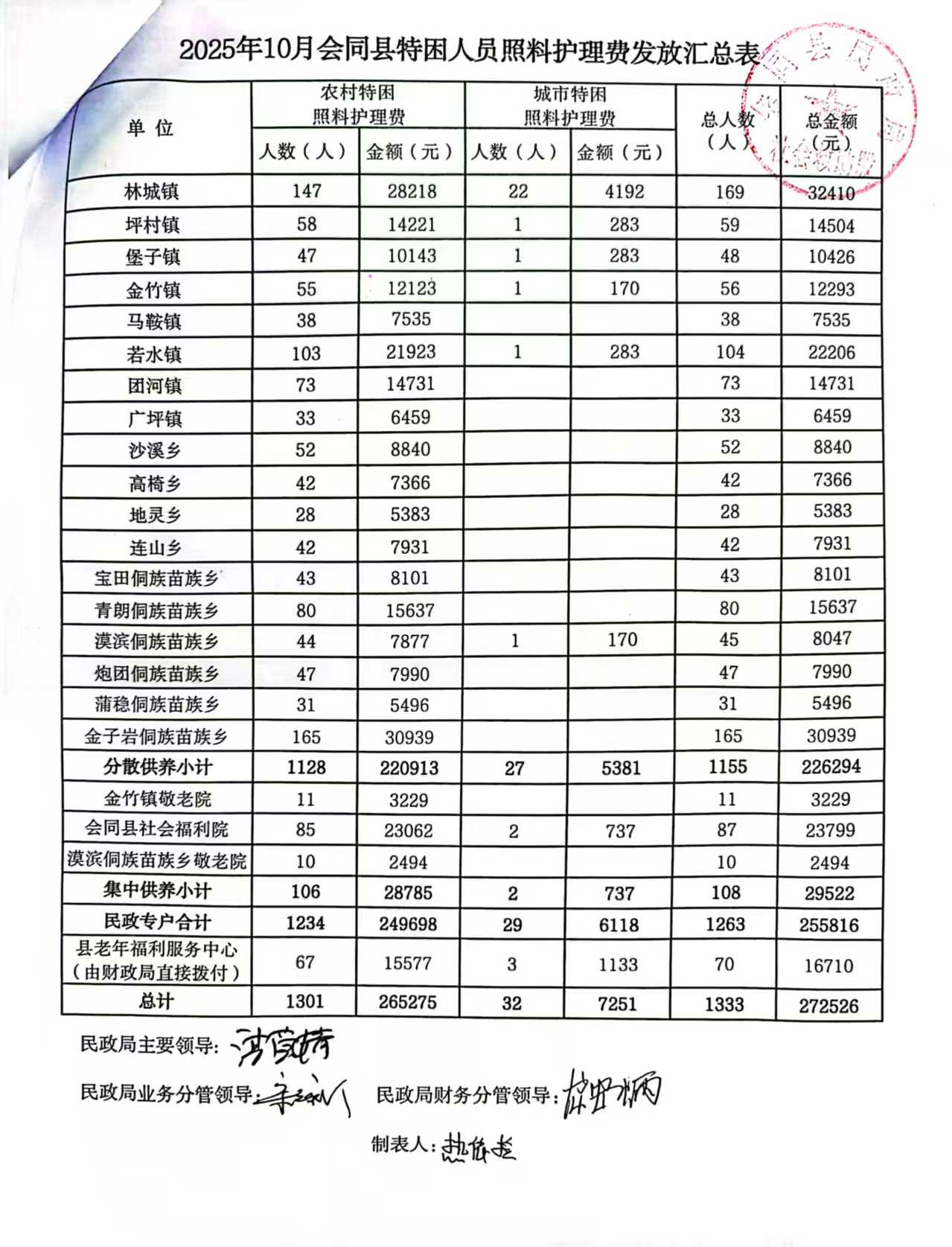 2025年10月会同县特困人员照料护理费发放汇总表