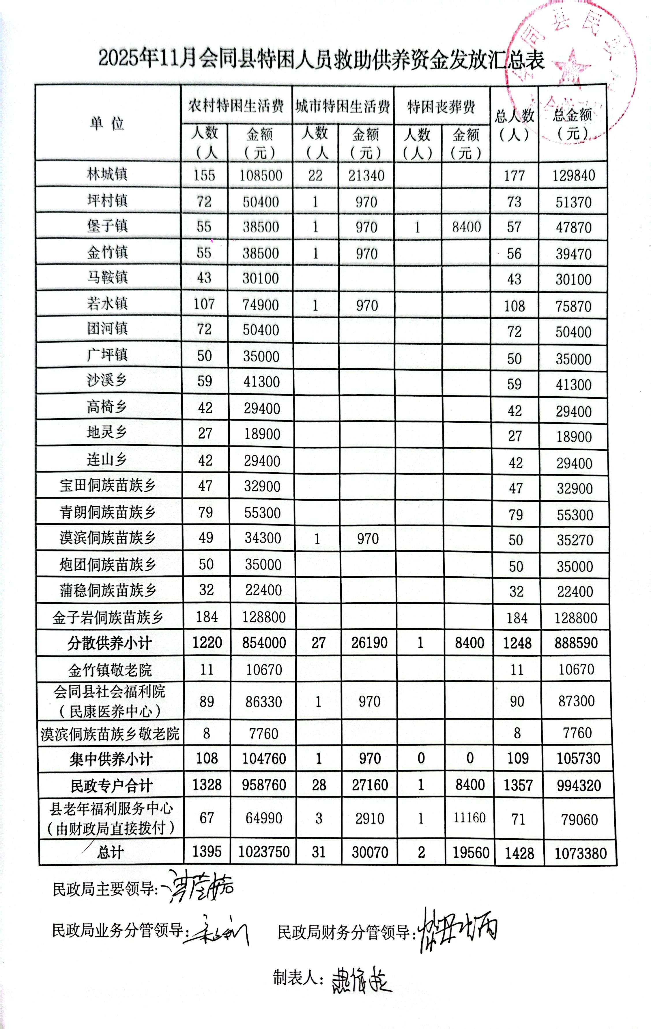 2025年11月会同县特困人员救助供养资金发放汇总表