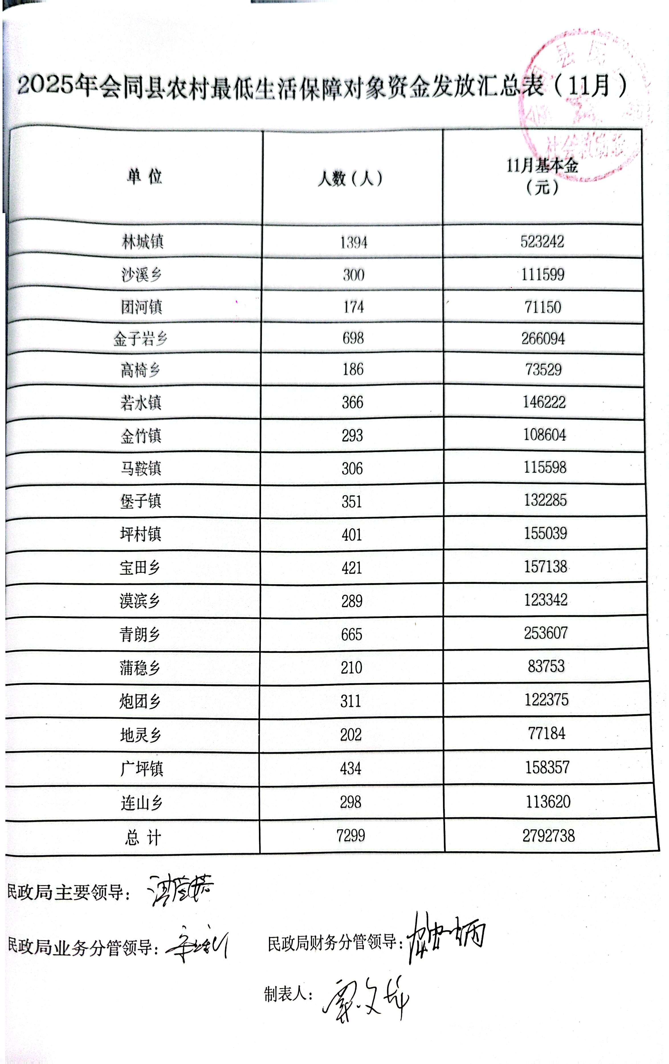 2025年会同县农村最低生活保障对象资金发放汇总表(11月)