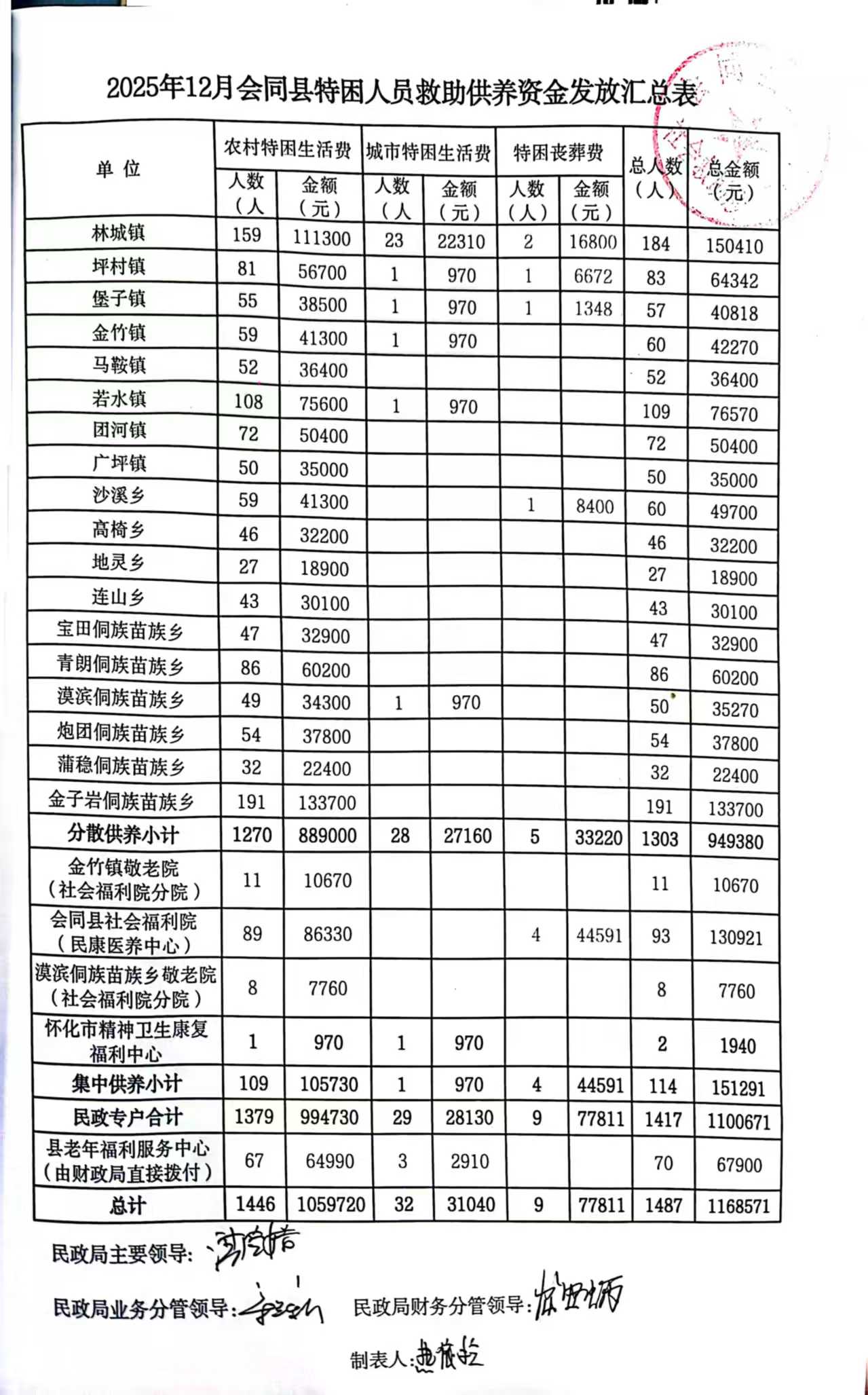 2025年12月会同县特困人员救助供养资金发放汇总表