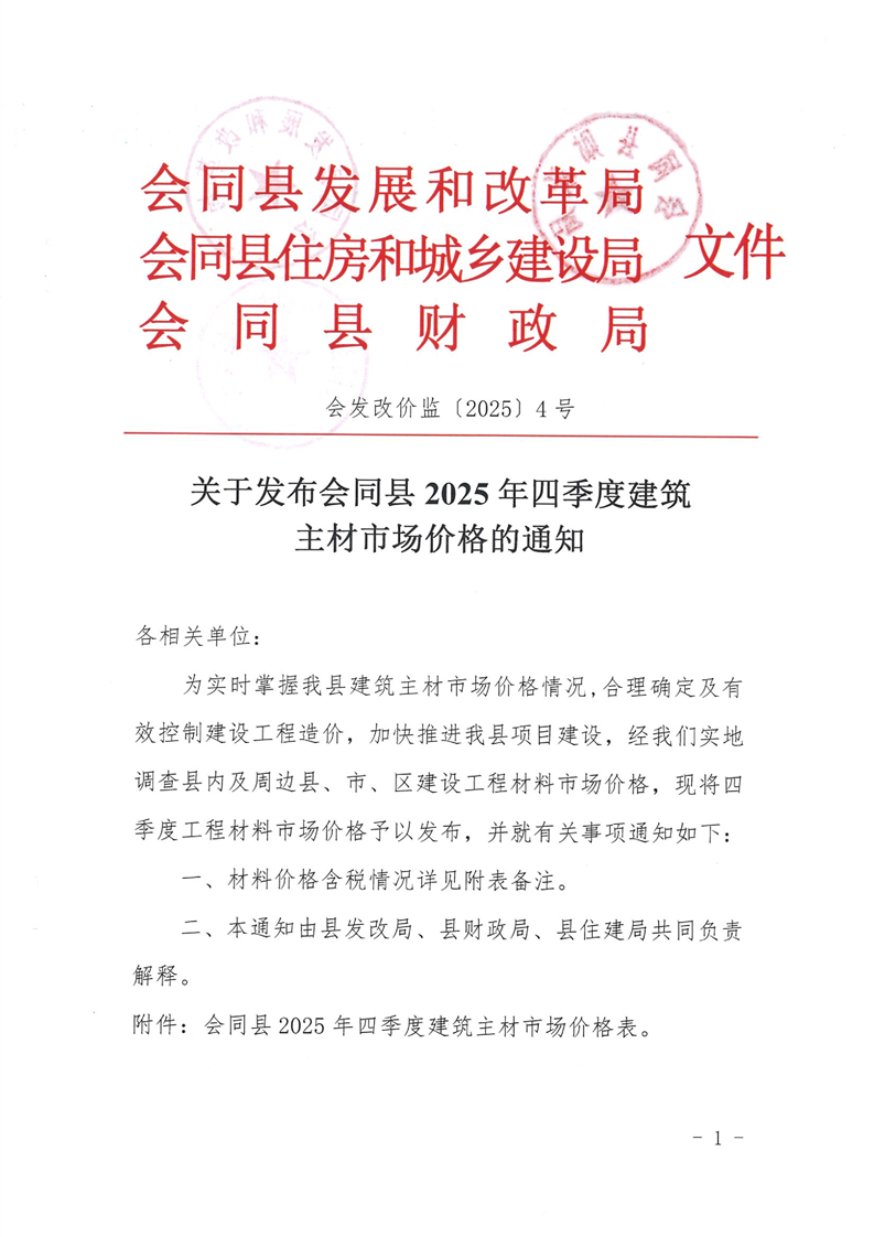 关于发布会同县2025年四季度建筑主材市场价格的通知