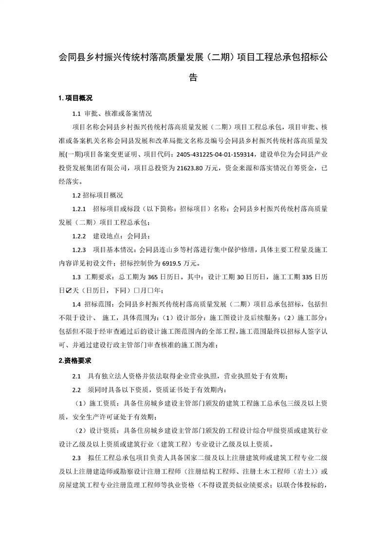 会同县乡村振兴传统村落高质量发展(二期)项目工程总承包招标公告
